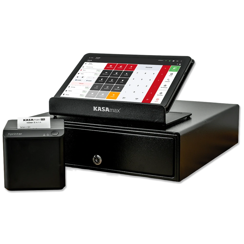 Součástí balení je pokladní zařízení, kovový stojan a bluetooth tiskárna (šířka kotoučku 57–58 mm). V rámci konfigurátoru si k pokladní stanici můžete zvolit variantu s pokladní zásuvkou: